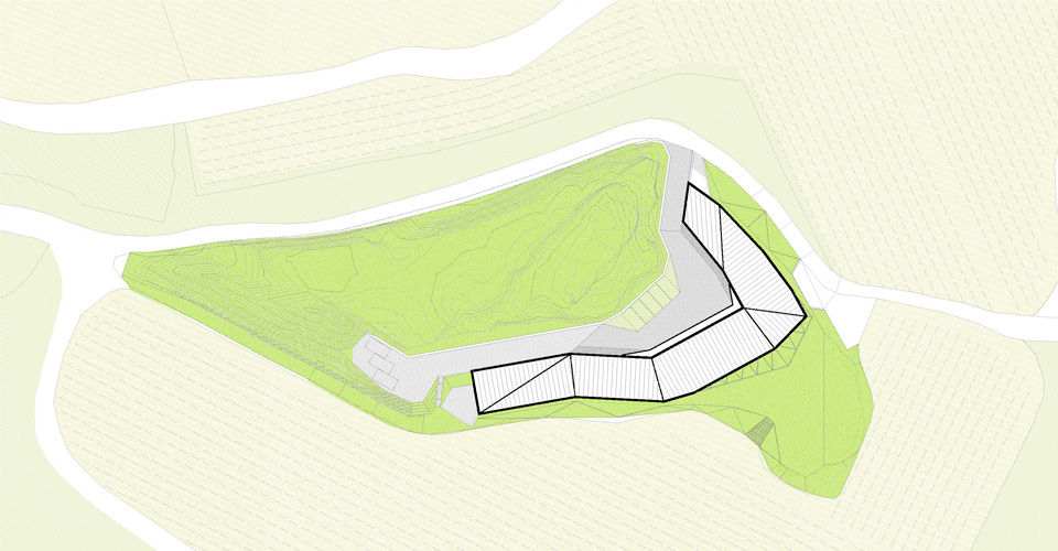 La parcela formaliza una pequeña loma que se eleva unos 8 m sobre el nivel de los viñedos colindantes, constituyendo un punto alto dominante. Se aprovechan dichas condiciones del perfil natural para minimizar el impacto volumétrico de la edificación, al integrar al máximo su volumetría mediante la adaptación del edificio a la topografía siguiendo las líneas de nivel, disfrutando de la orientación sur. Paisajísticamente se trabaja desde la idea de mínima intervención evitando la introducción de especies vegetales que artificialicen el espacio exterior.