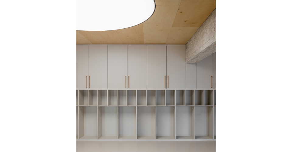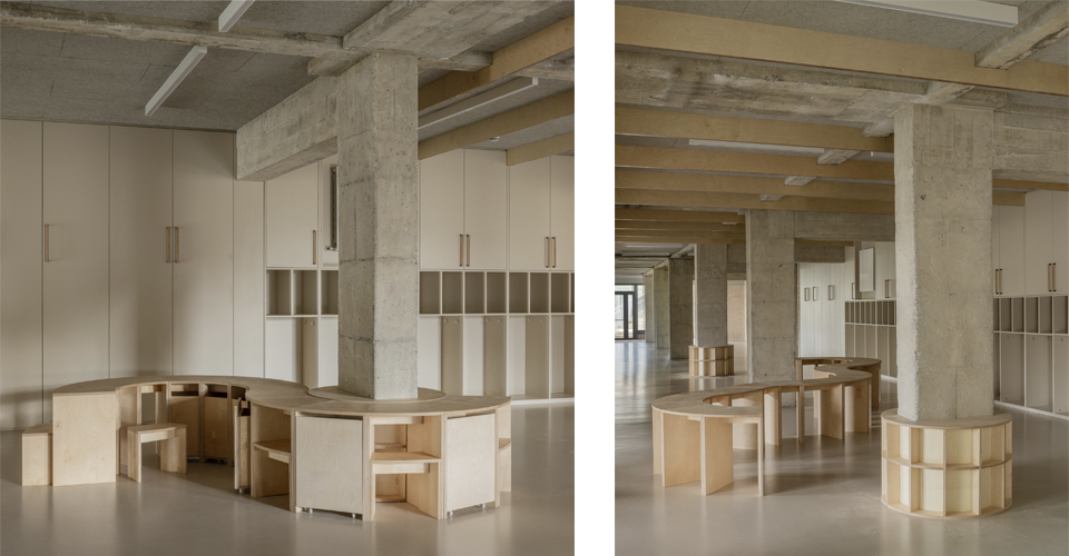 La paleta material acentúa el hormigón visto de la estructura, que es acompañado por la fábrica de ladrillo blanco, la calidez del abedul y la luz natural.