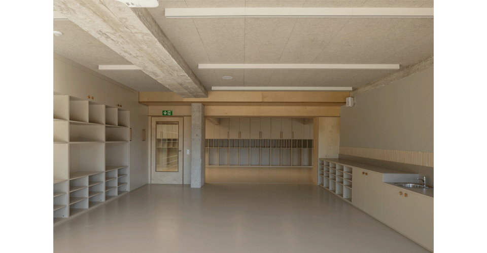 The material palette accentuates the raw concrete of the structure, which is accompanied by white brickwork, the warmth of birch wood and natural light.