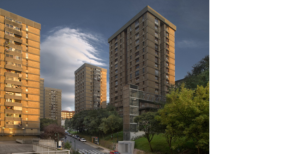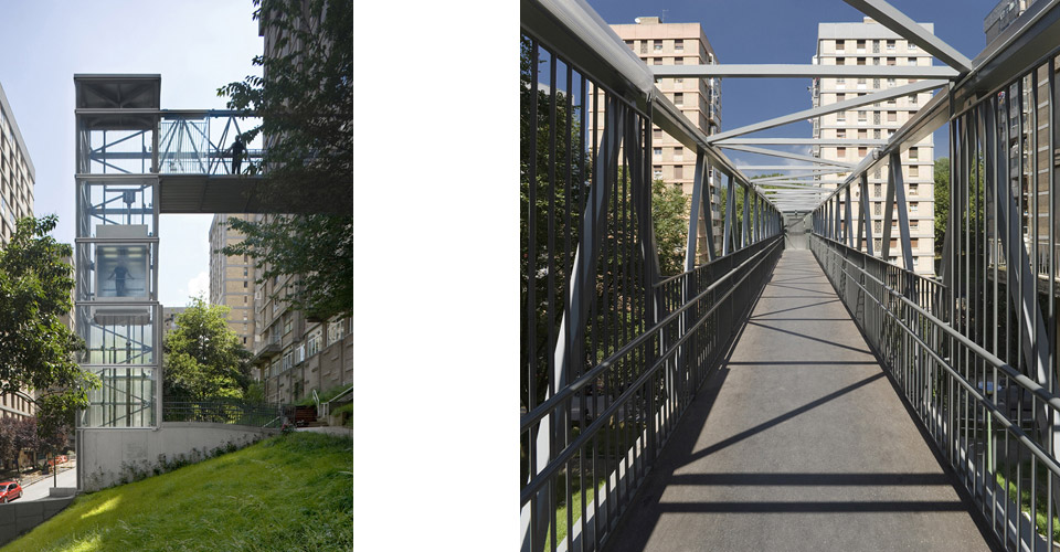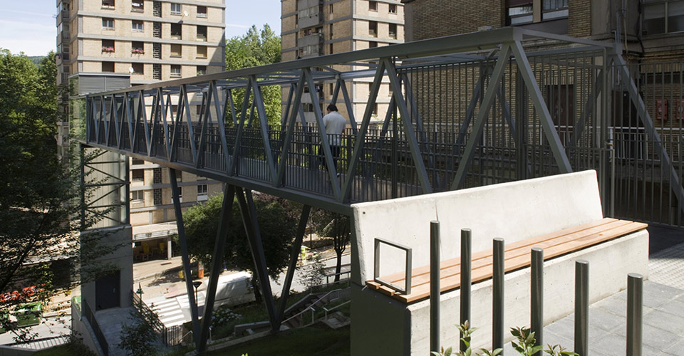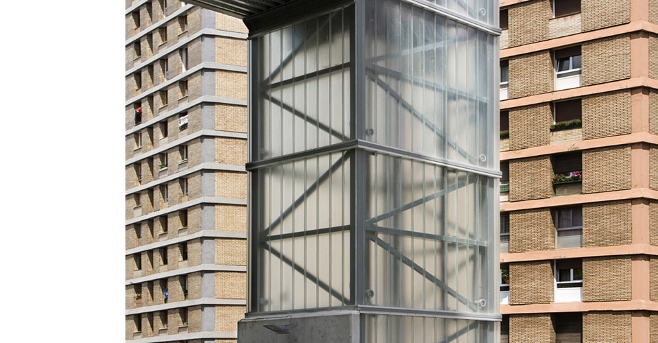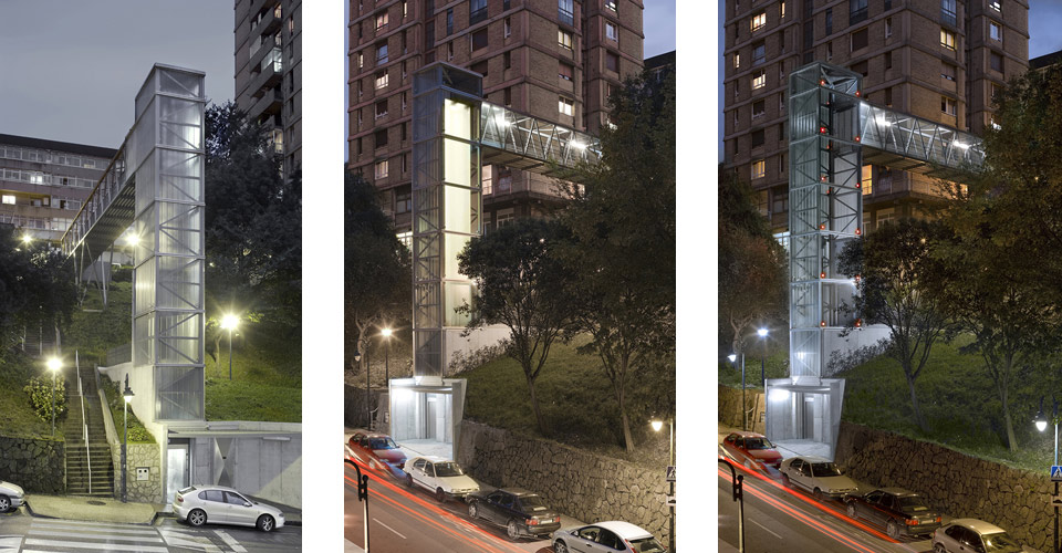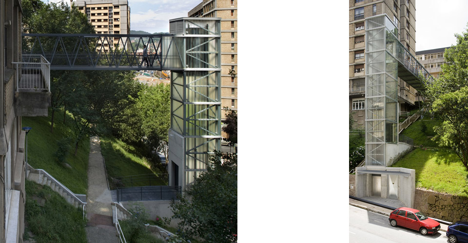 This urban elevator solves pedestrian accessibility between Sorgintxulo and Basanoaga streets, in Kaputxinos dense neighborhood. The existence of stone walls, a pedestrian at middle height, and a small extension of the sidewalk at higher level, serve to integrate the piece naturally in the urban context.