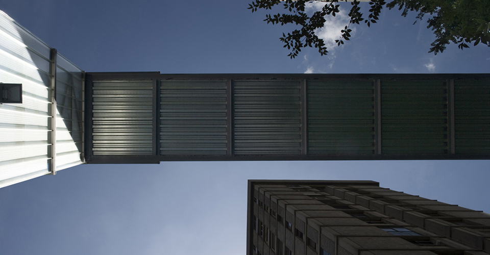 The lightness of the structure and the transparency of its closings, take contrast with the hardness and massiveness of the towers of the high density neighbourhood.