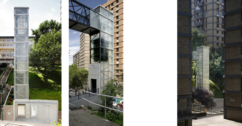 Este ascensor urbano resuelve la accesibilidad peatonal entre la calles Sorgintxulo y Basanoaga en el denso barrio de Kaputxinos. La existencia de unos muros de piedra, una vía peatonal intermedia, así como una pequeña ampliación de la acera en el ámbito superior, sirven a la pieza para insertarse de modo natural en el contexto urbano. La ligereza de la estructura y la transparencia de su envolvente contrastan con la dureza y masividad de las torres que conforman el barrio residencial.